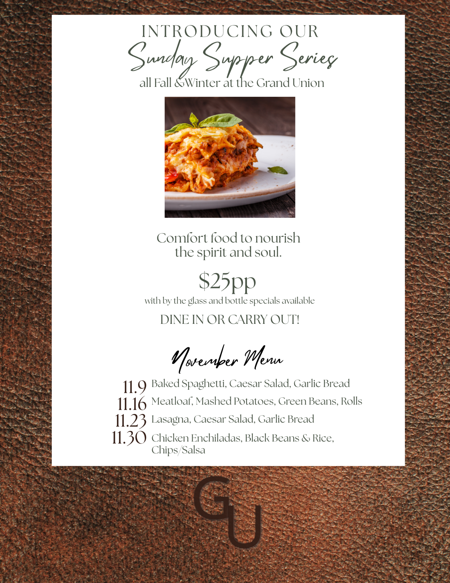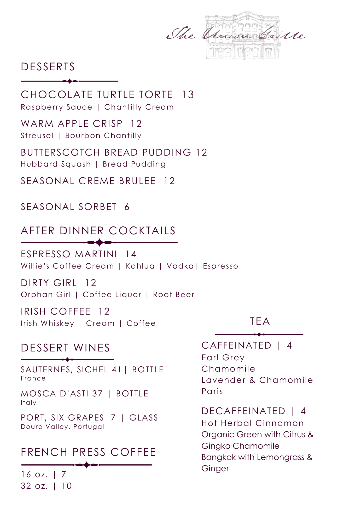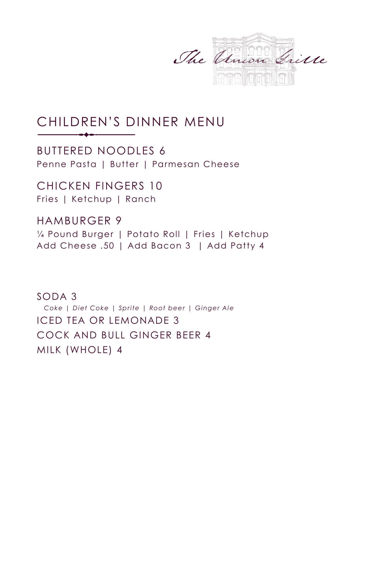 The Union Grille is open for evening dining from 5pm to 9pm. During the Summer Peak Season (June 1 –September 30), we are open 7 nights a week. Beginning October 1 and going through May 31, we are open for dinner service 5 nights a week (Wednesday through Sunday).